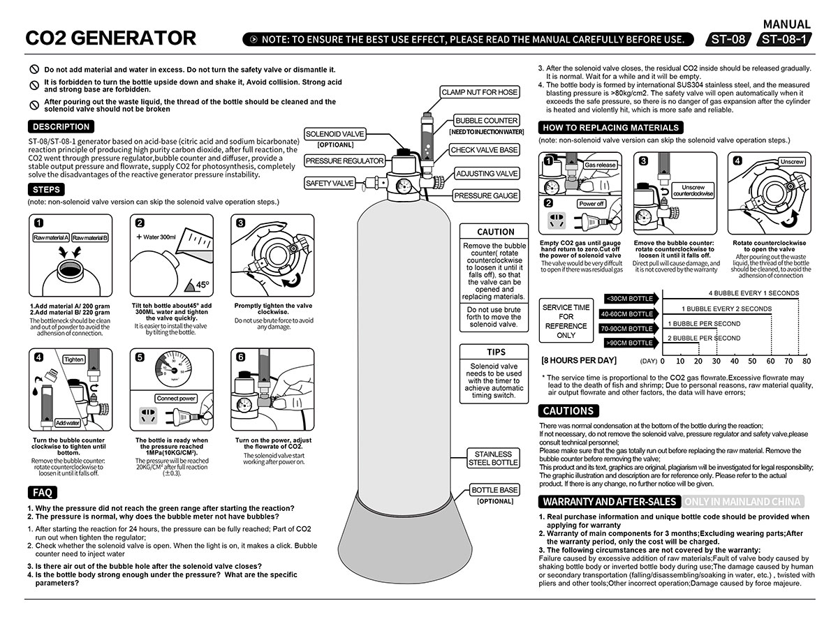 El diseño compacto del dispositivo permite una fácil instalación en acuarios de distintos tamaños sin ocupar demasiado espacio. Los usuarios simplemente siguen las instrucciones para iniciar fácilmente el proceso de reacción agregando las materias primas, lo que garantiza una fácil operación y un bajo mantenimiento. La presión de salida estable permite a los usuarios monitorear claramente la tasa de liberación de CO2 utilizando el contador de burbujas, lo que permite un mejor ajuste del suministro para mantener un ambiente de acuario equilibrado y estable.